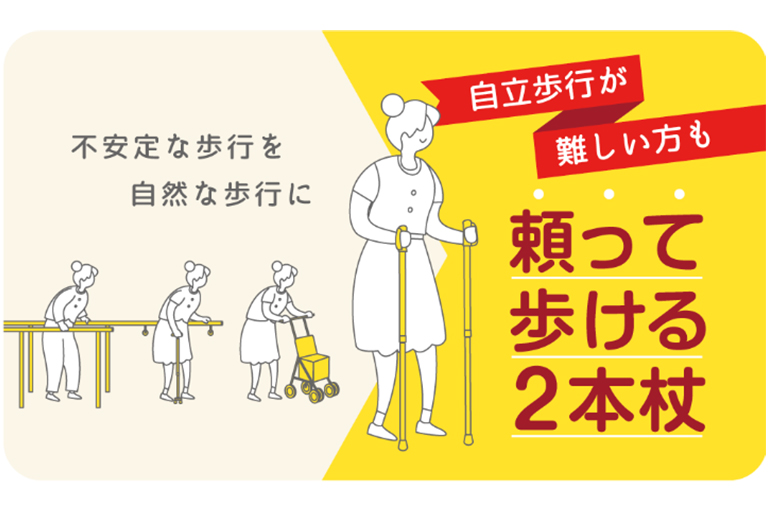 従来の2本杖では推奨できなかった荷重をかけた使用や、体格の大きな方も使用可能な歩行サポート専用2本杖。