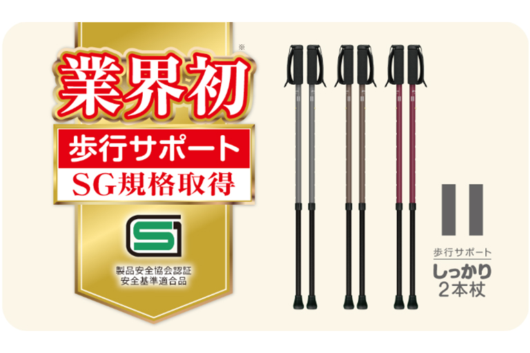 業界で初めて製品安全協会が定めた安全基準の1つ、ウォーキングサポート基準をクリア。従来のウォーキングポールよりも高い耐荷重性能だから、2本杖に頼って歩きたい方にも使用いただけます。