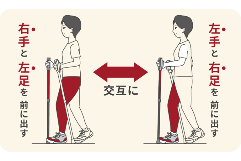 歩く動作に2本杖を両手に持つだけだから、特別な訓練は不要。どなたでも使用いただけます。右足を踏み出すときに左手を前に、1・2・1・2と歩いてみましょう。