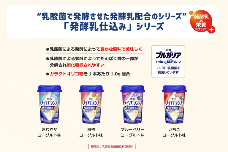 メイバランスは、少量で効率よく栄養が摂れる飲料タイプの栄養補助食品です。
